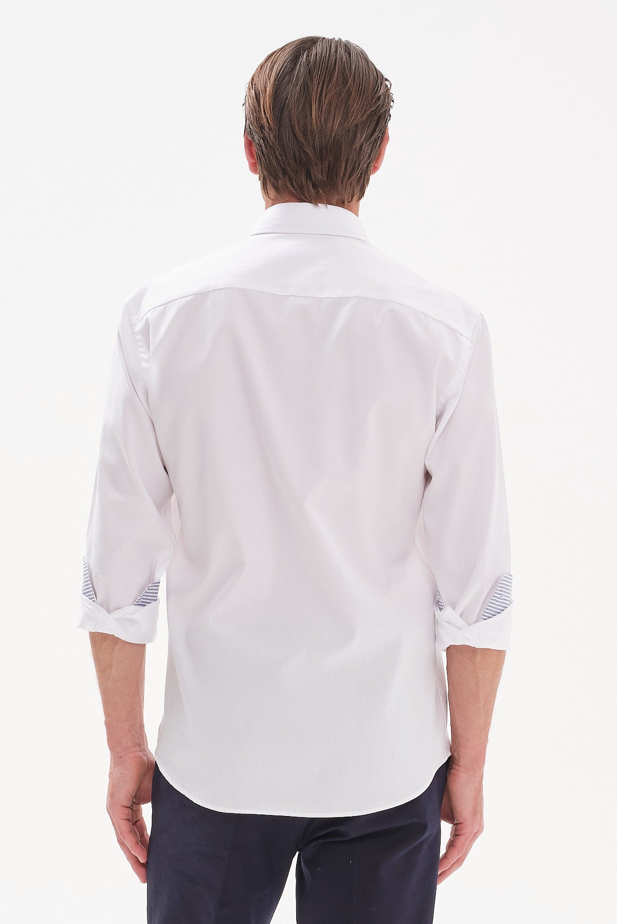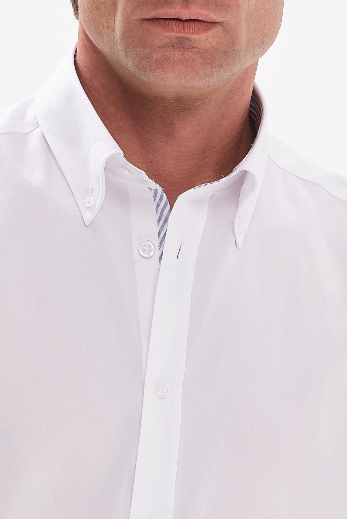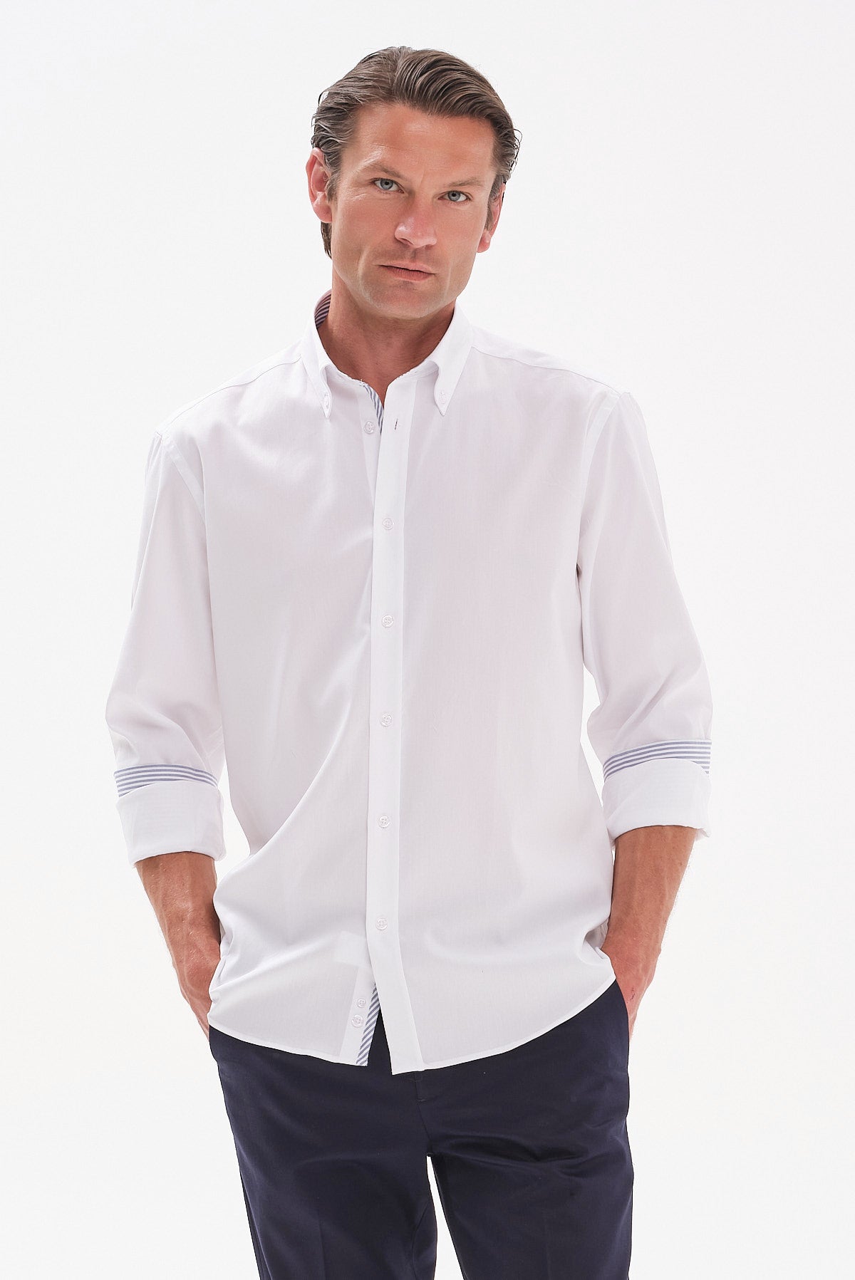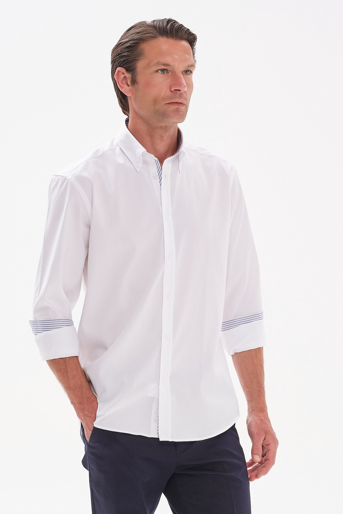 - Πουκάμισο λευκό, με κουμπάκια στο γιακά και ριγέ σιελ λεπτομέρειες στο εσωτερικό του κολλάρου, της πατιλέτας και της μανσέτας, για εντυπωσιακά καλοκαιρινά casual looks στην πόλη και τις διακοπές.