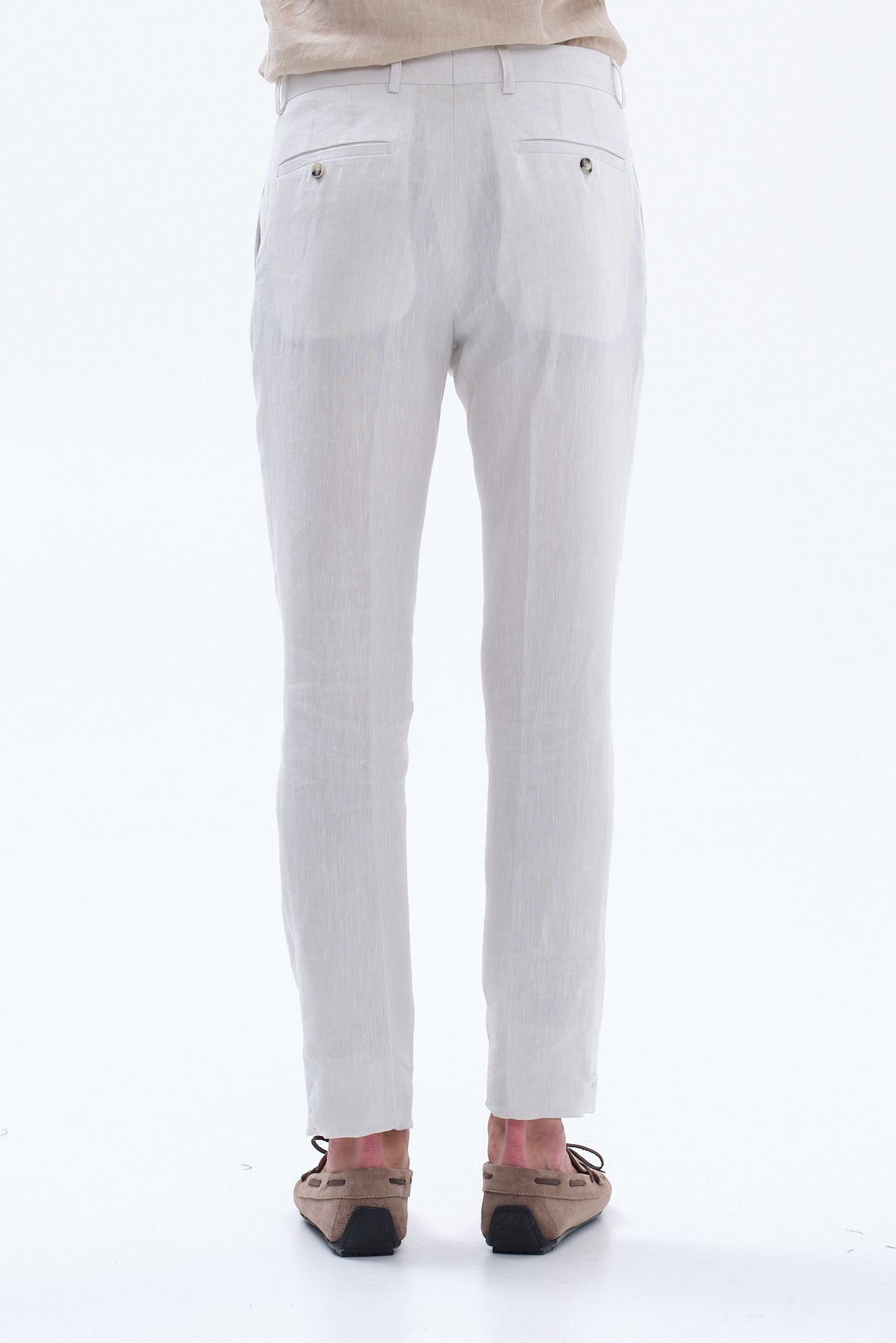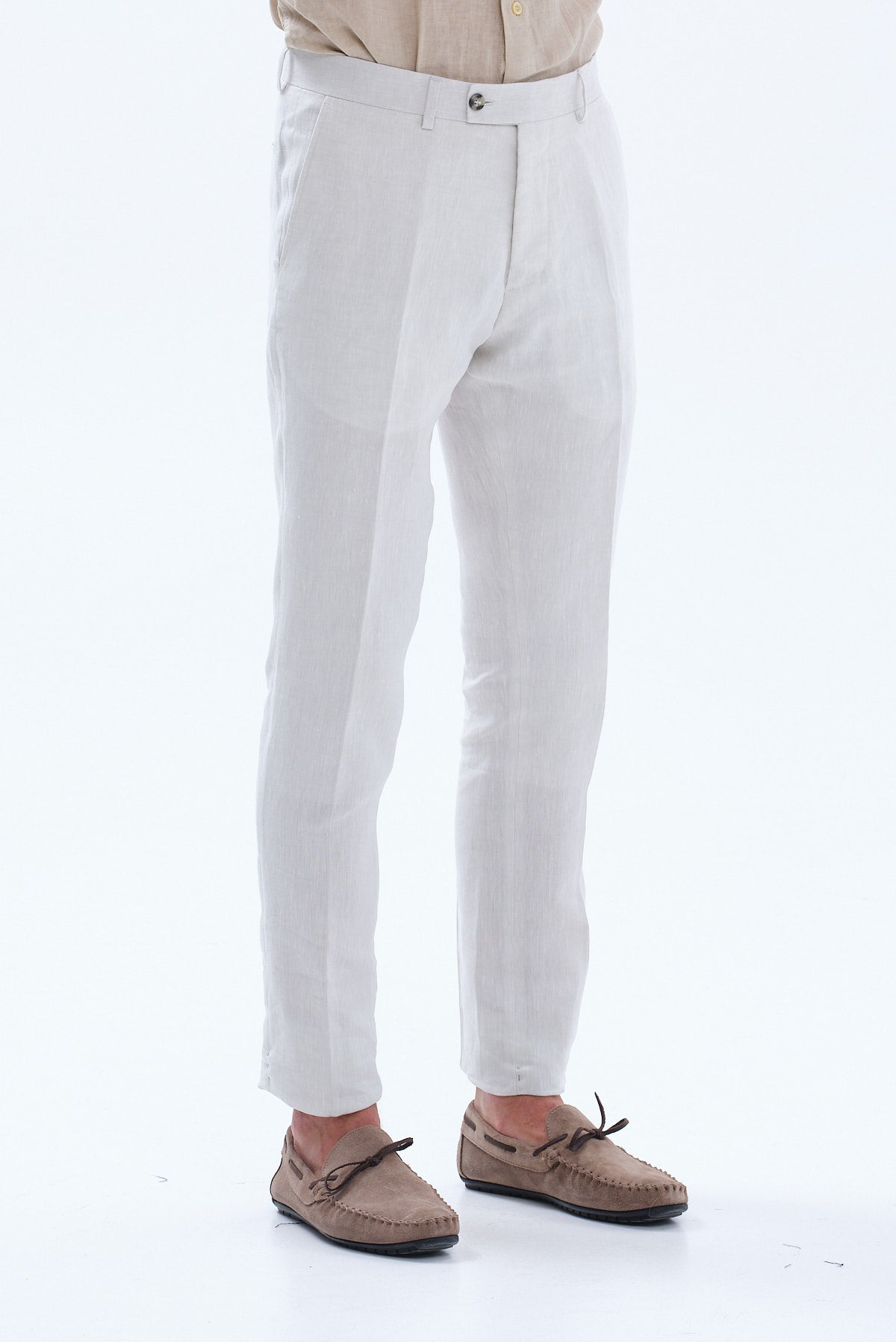 - Παντελόνι λινό chinos σε απόχρωση του πάγου και slim γραμμή. Για casual εμφανίσεις το καλοκαίρι, στην πόλη και τις διακοπές.