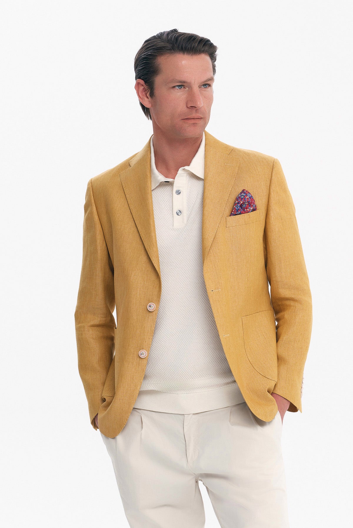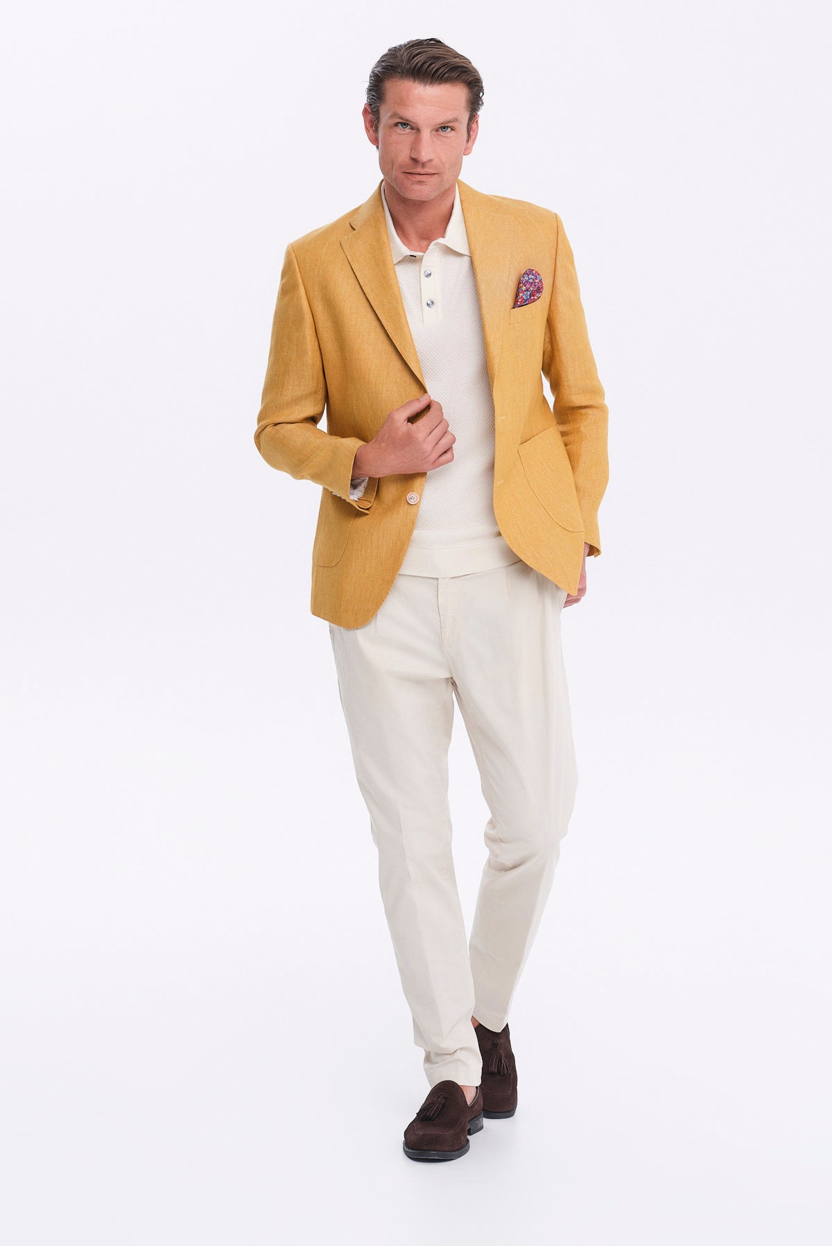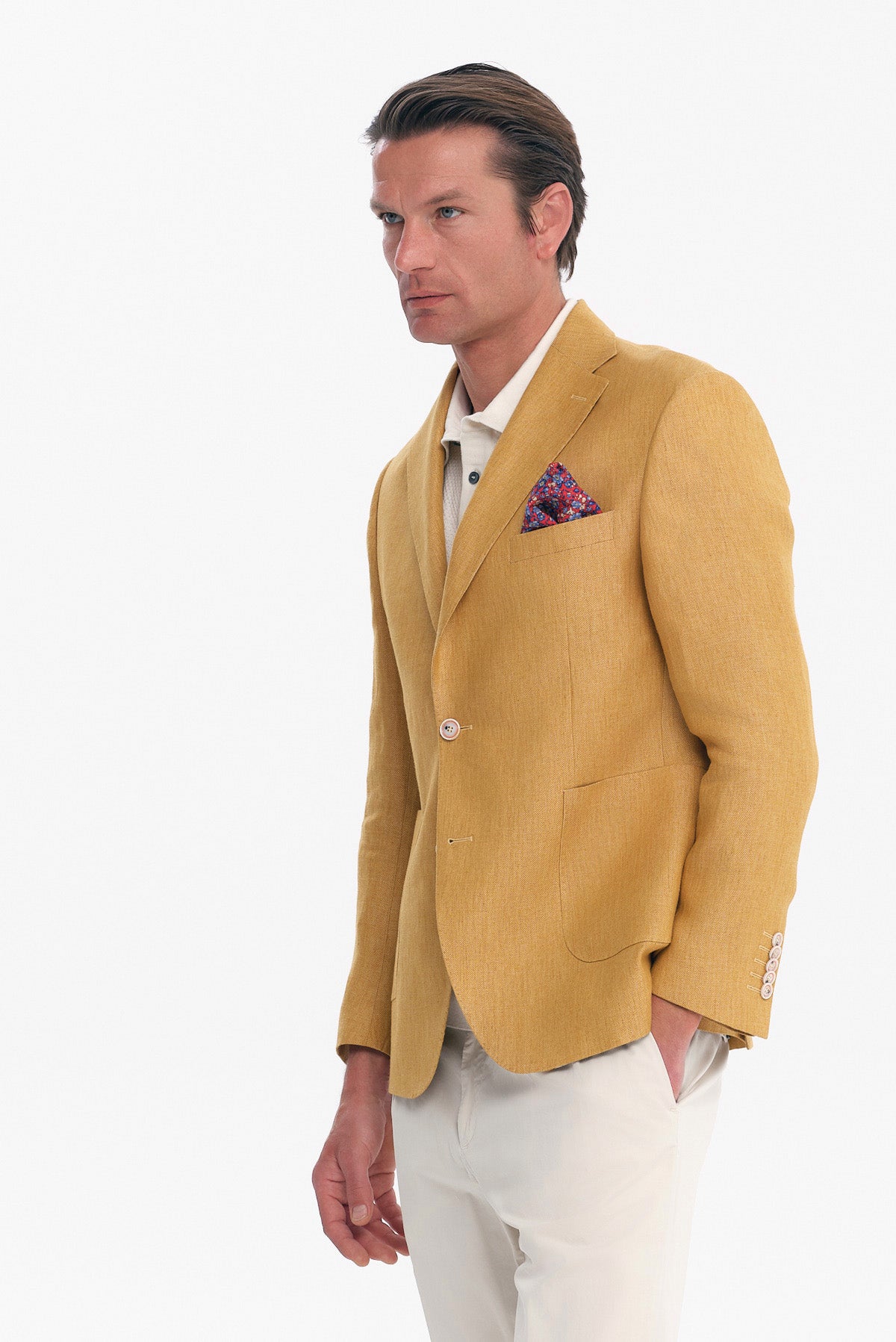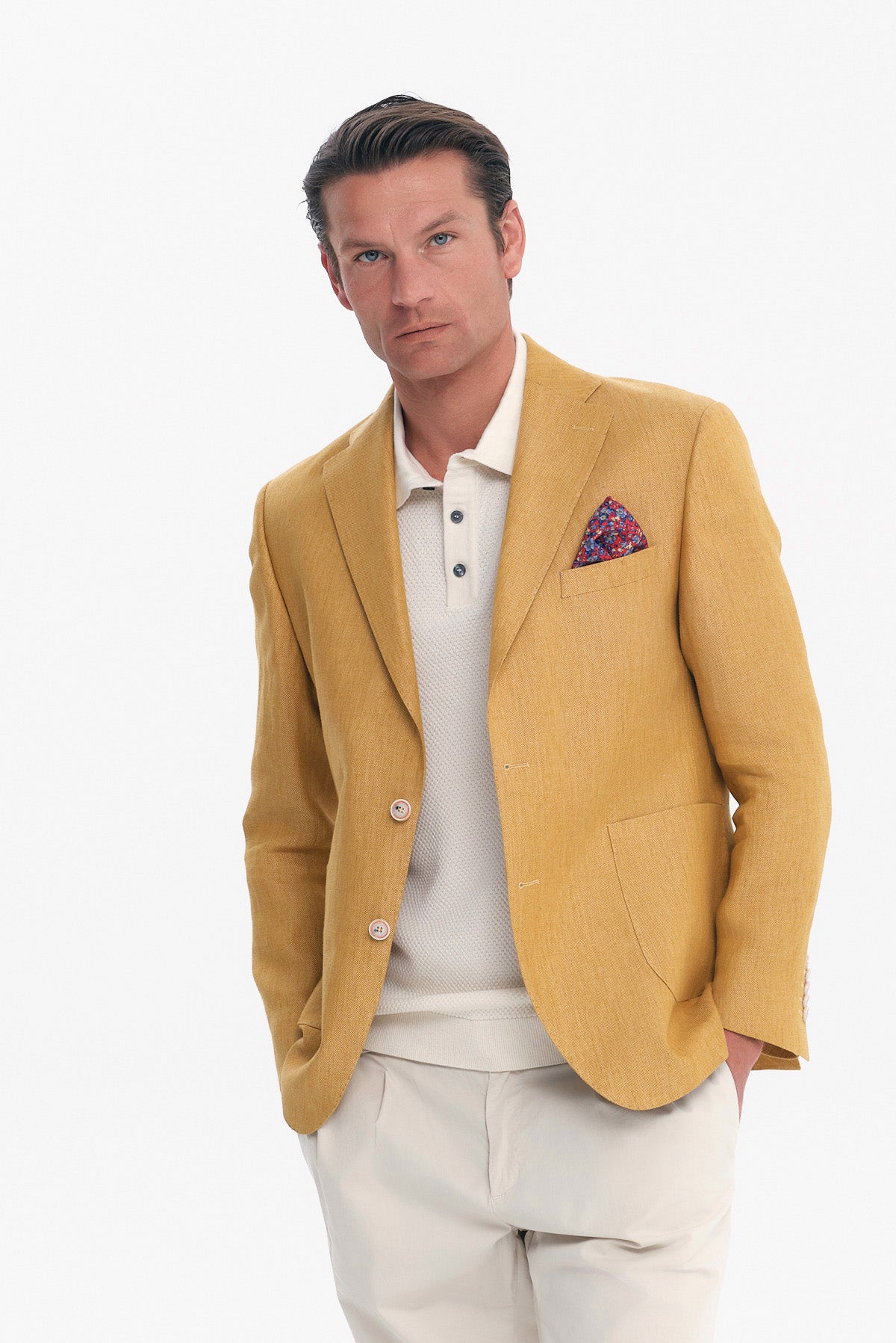 - Σακάκι μονόπετο, δίκουμπο σε μουσταρδί απόχρωση με ύφασμα Angelico 100% λινό. Οι εξωτερικές (patch) τσέπες και η ελαφριά βάτα στους ώμους, χαρίζουν έναν ναπολιτάνικο αέρα. Κατάλληλο για πολλούς mix & match συνδυασμούς και πολλές stylish καλοκαιρινές εμφανίσεις καθ' όλη τη διάρκεια της ημέρας.