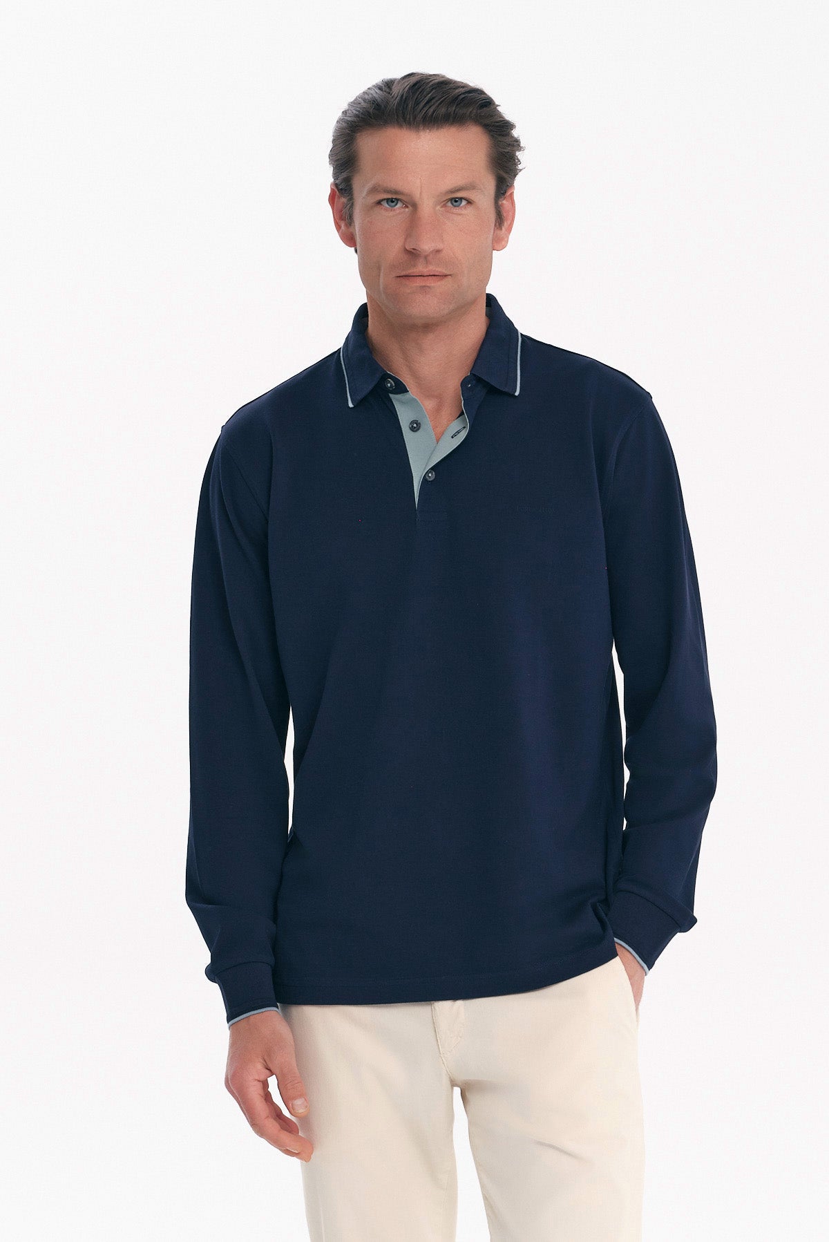 - Polo μακρυμάνικο, μπλε μονόχρωμο, με λεπτομέρειες στο γιακά και τρία κουμπιά κλείσιμο. Για ξεχωριστά σπορ και casual looks.