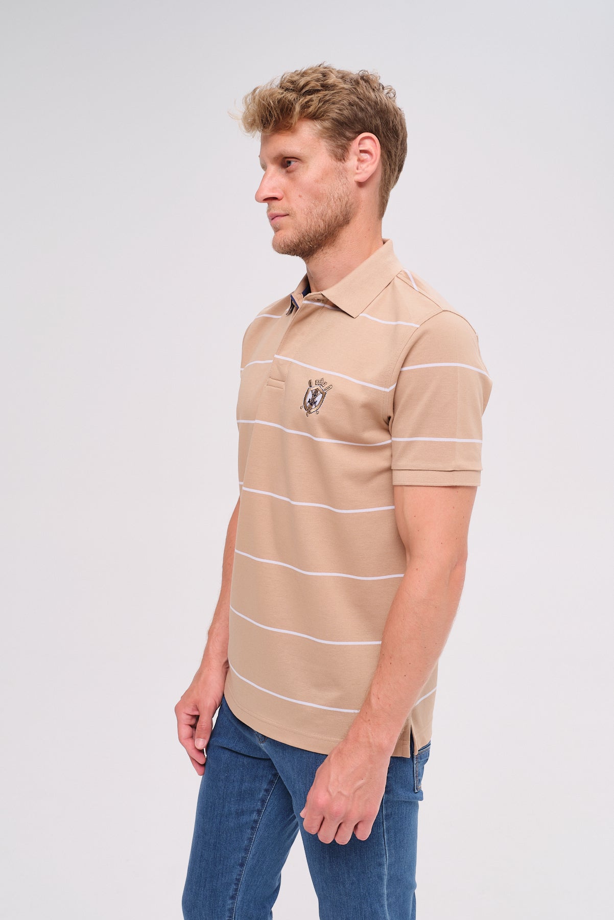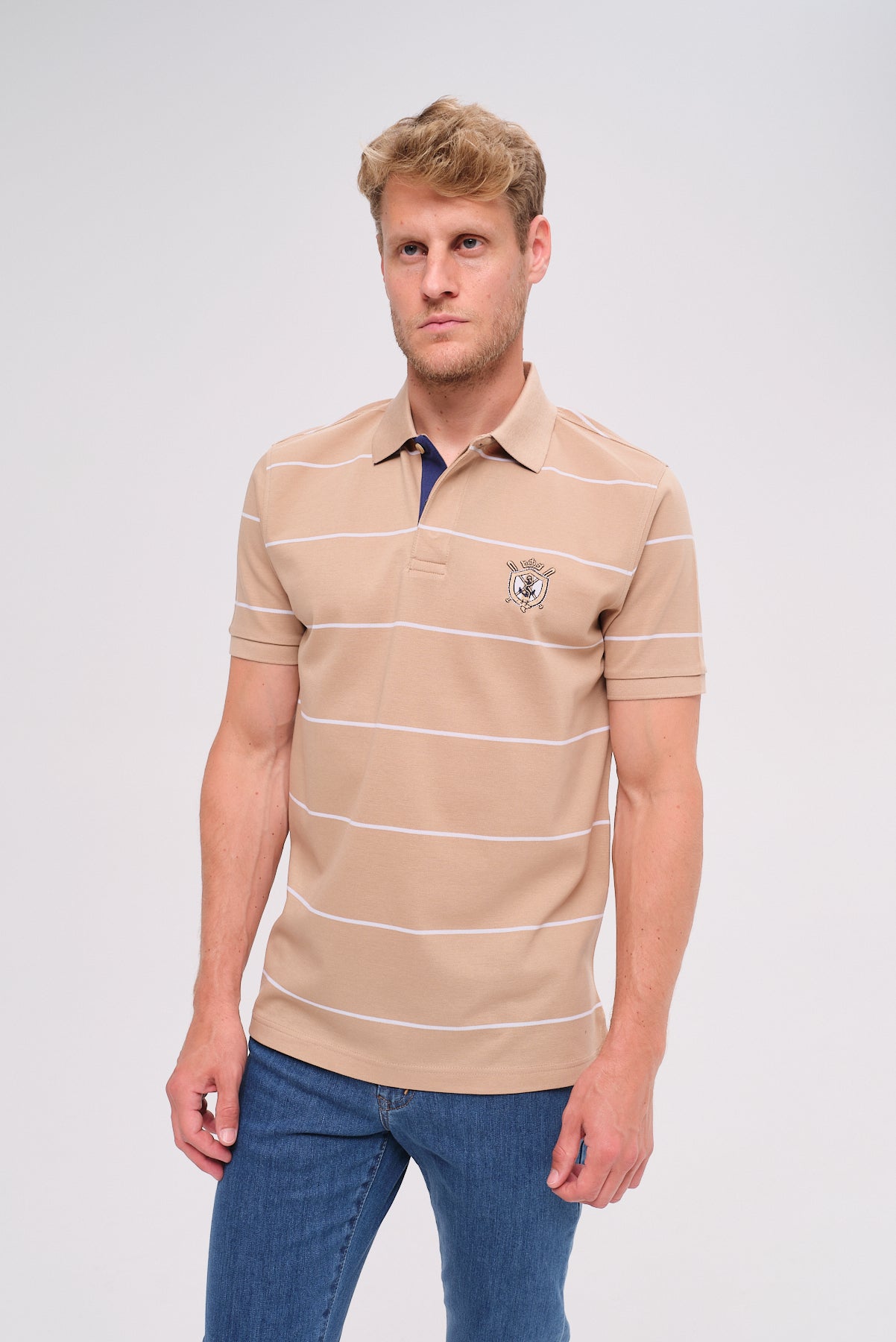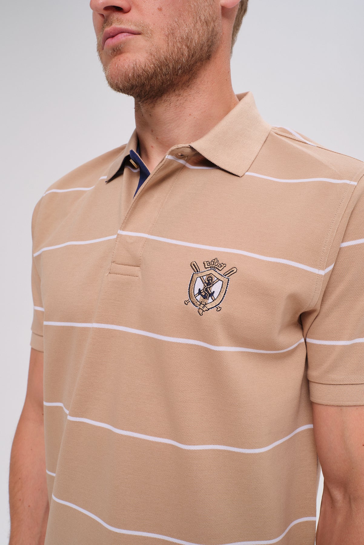 - Polo κοντομάνικο, σε μπεζ σκούρο χρώμα, με λευκές ρίγες και μπλε λεπτομέρεια στην πατιλέτα. Για ξεχωριστά σπορ και casual καλοκαιρινά looks.