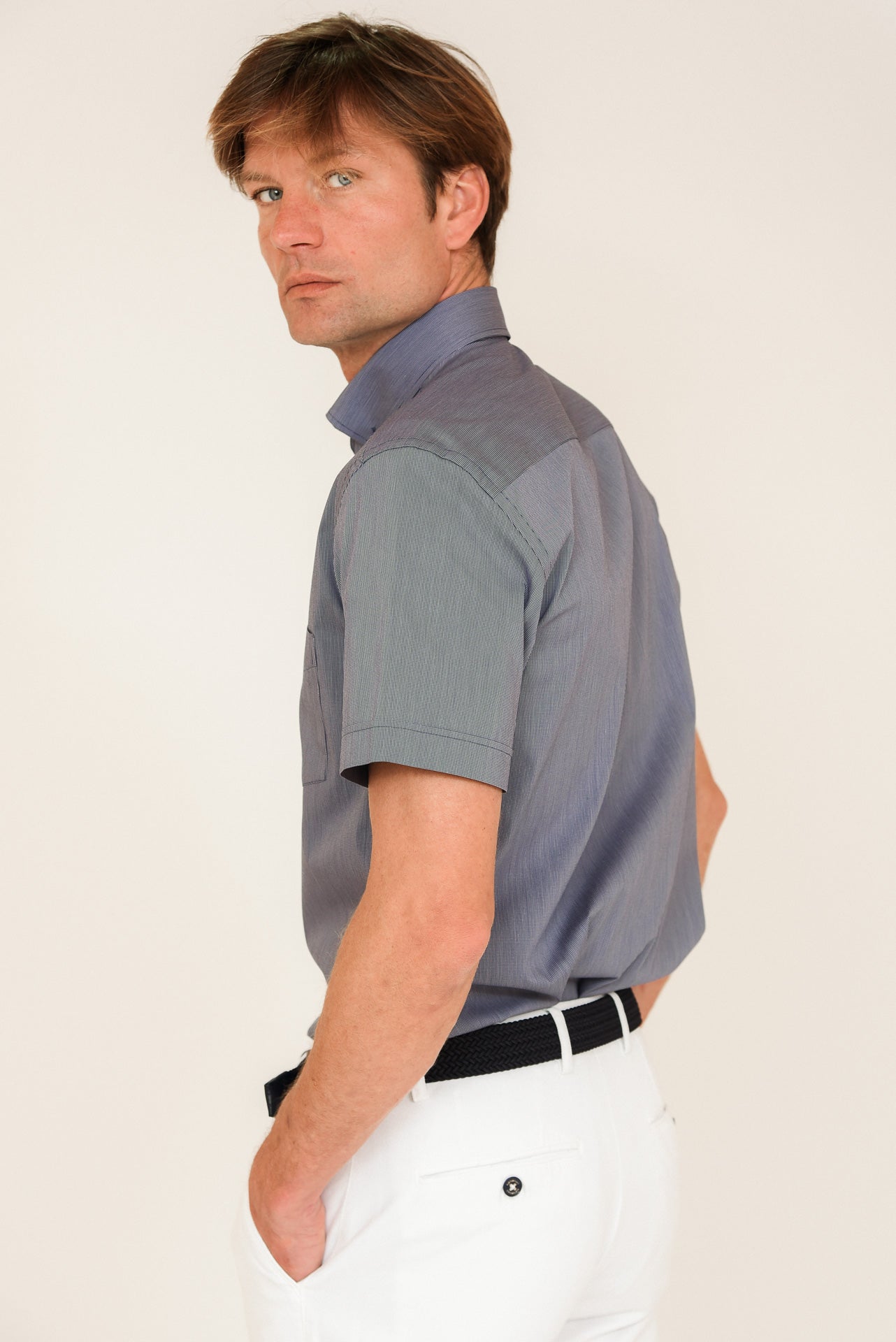 - Μονόχρωμο σιέλ πουκάμισο κοντομάνικο με κουμπάκια στο γιακά. Συνδυάστε το με τα παντελόνια και τις βερμούδες σας και δώστε την απαραίτητη αίσθηση του καλοκαιριού στην εμφάνισή σας.