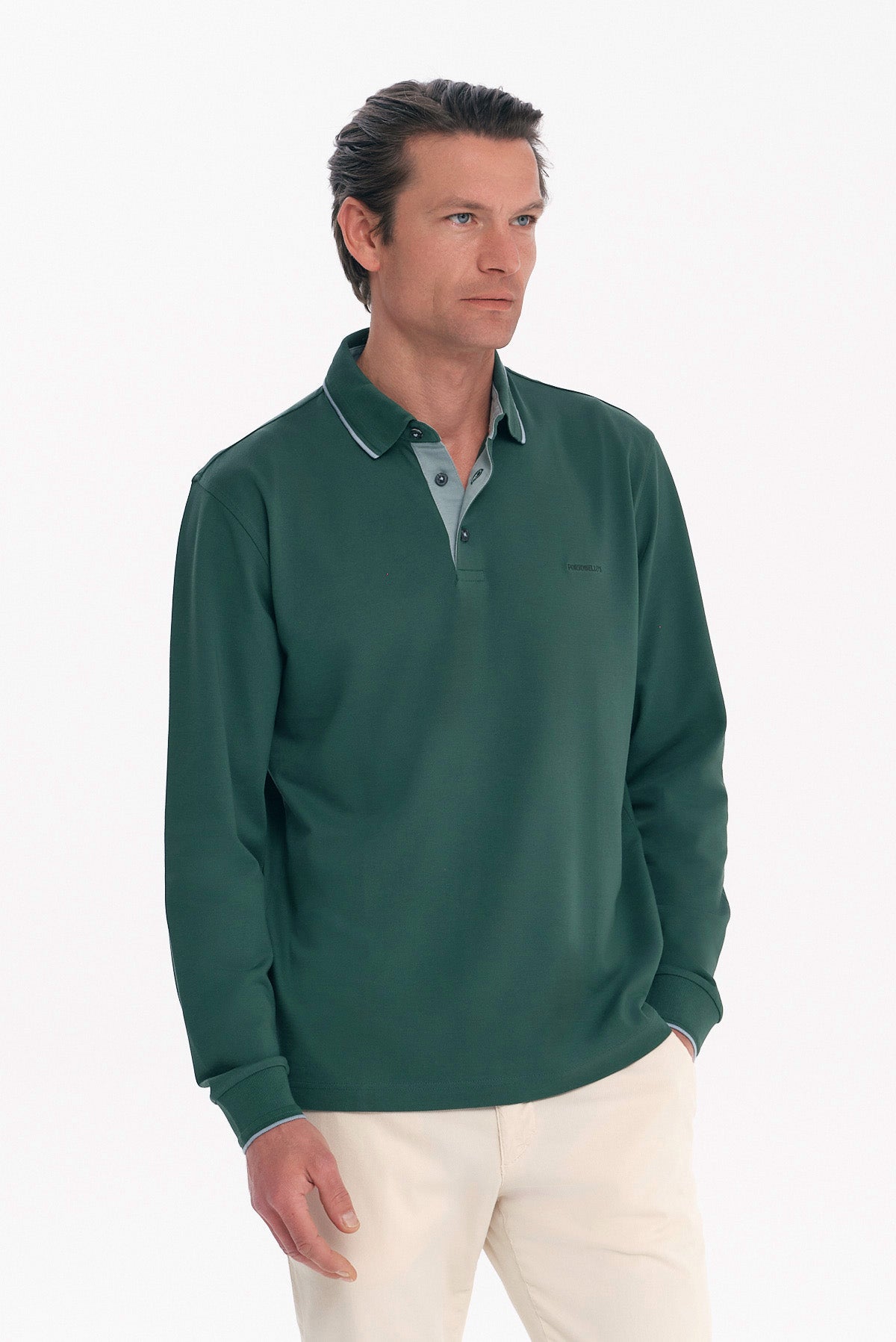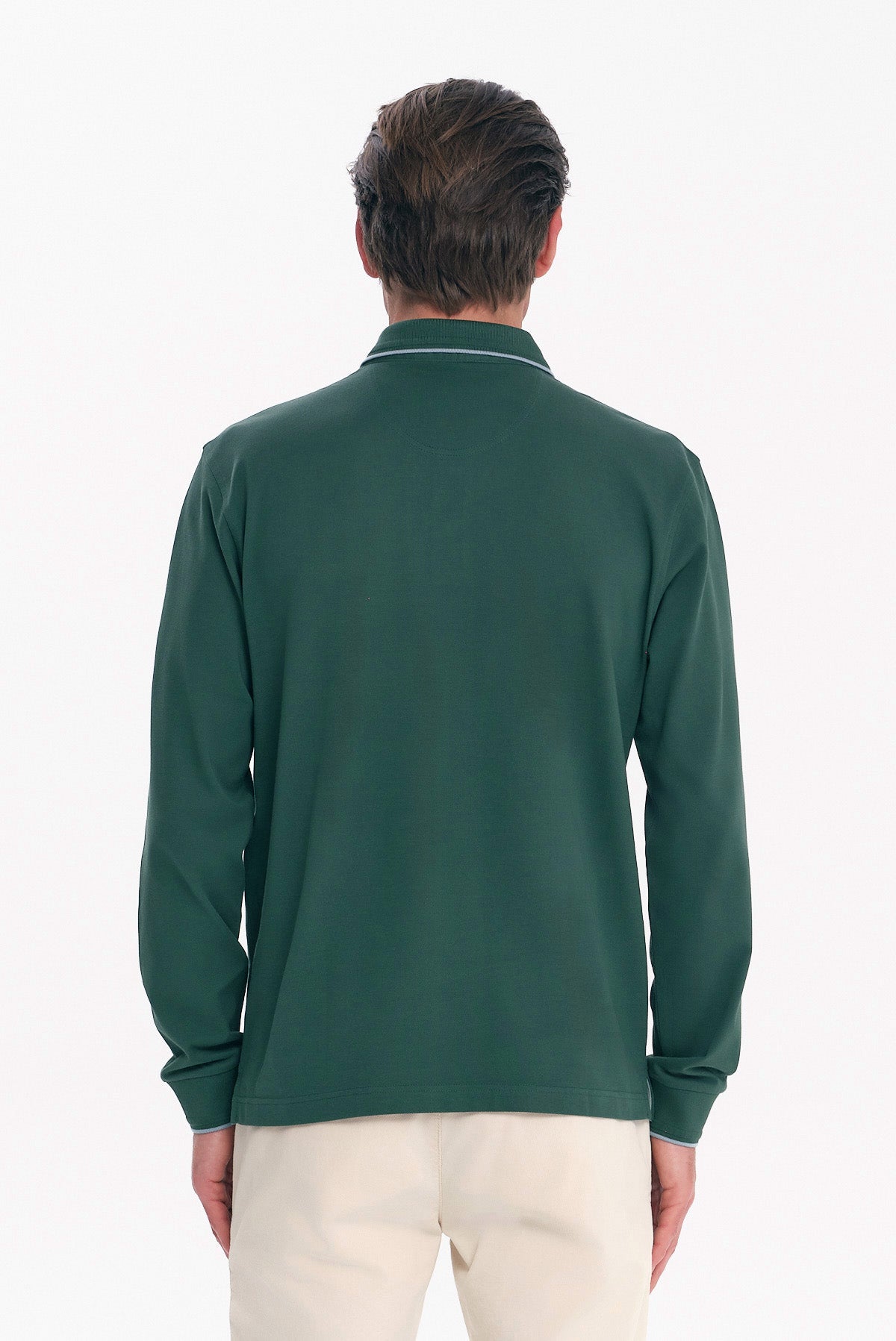 - Polo μακρυμάνικο, πράσινο μονόχρωμο, με λεπτομέρειες στο γιακά και τρία κουμπιά κλείσιμο. Για ξεχωριστά σπορ και casual looks.