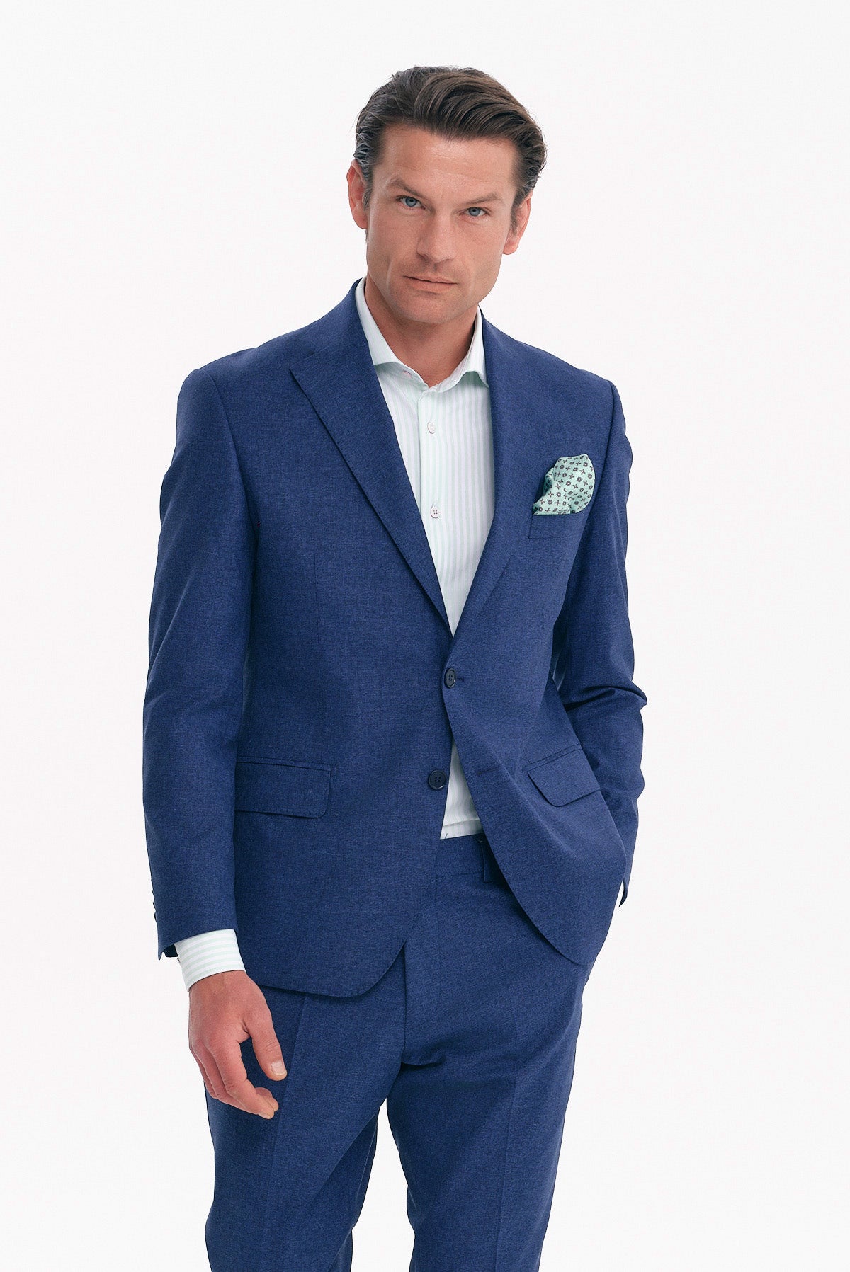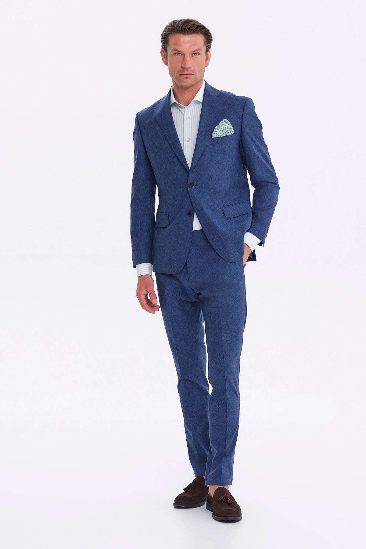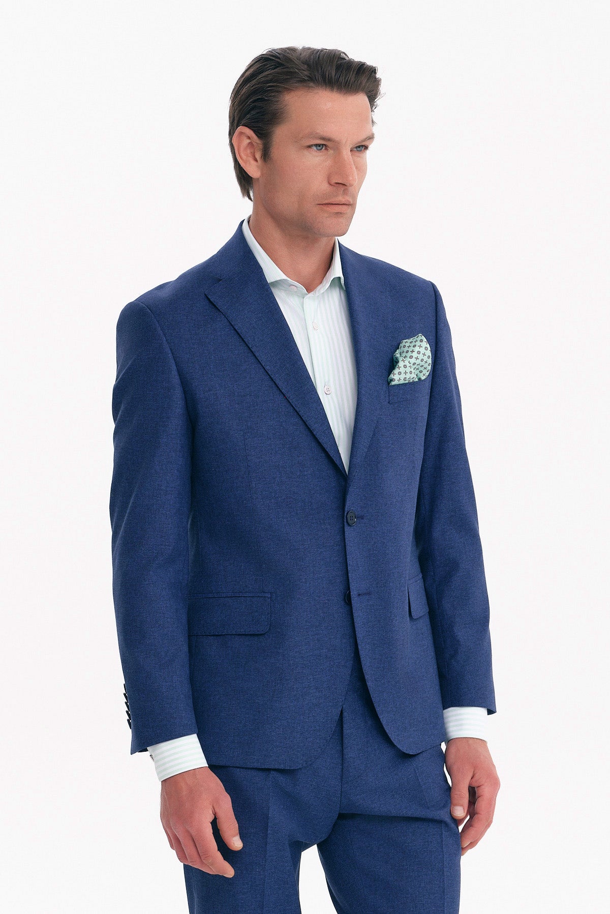 - Κοστούμι μονόπετο, δίκουμπο, σε μπλε ραφ απόχρωση και slim γραμμή, με ύφασμα Guabello με σύνθεση από μαλλί, βαμβάκι και μετάξι. Ένα εντυπωσιακό κοστούμι για τις πιο ιδιαίτερες εμφανίσεις και συνδυασμούς.