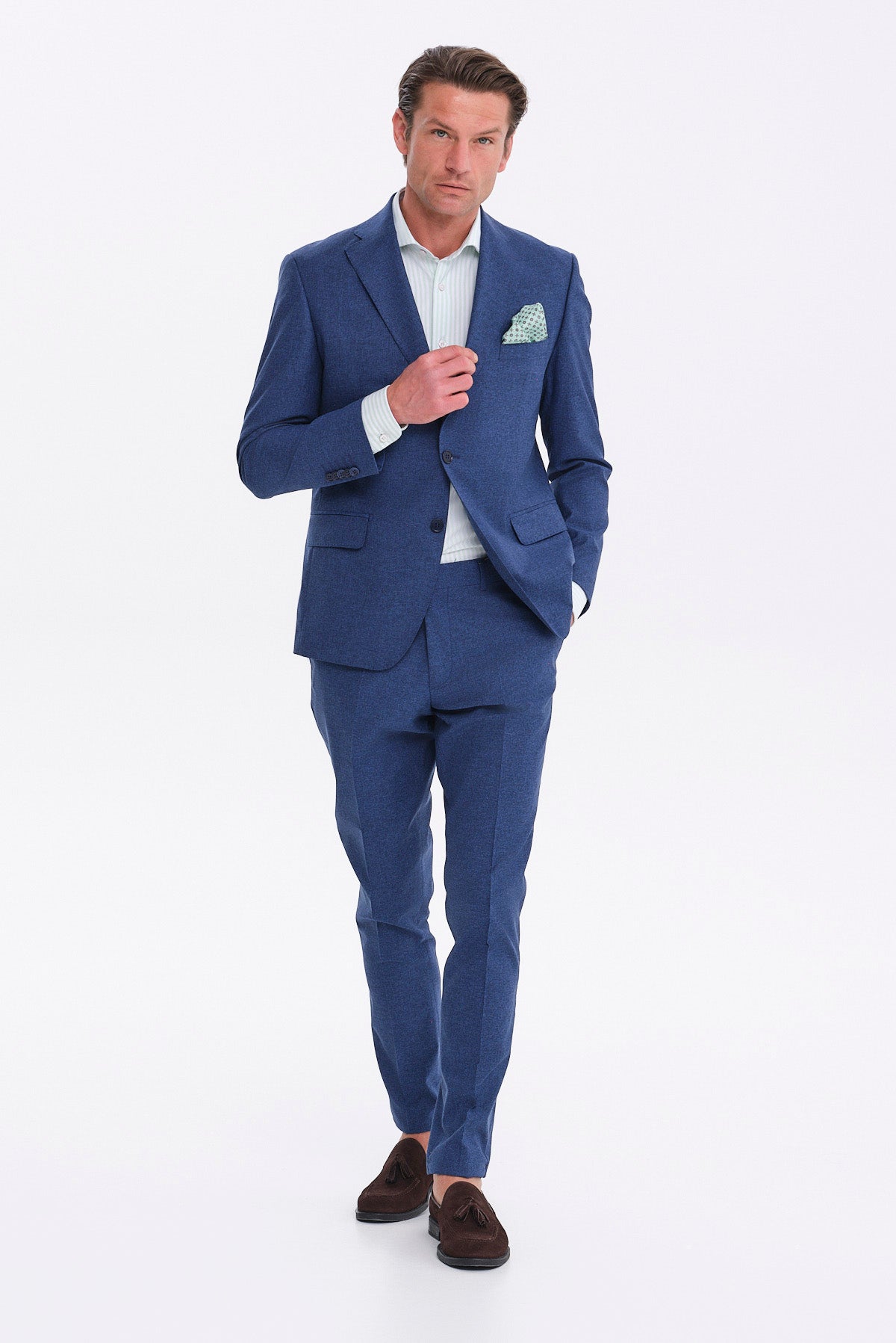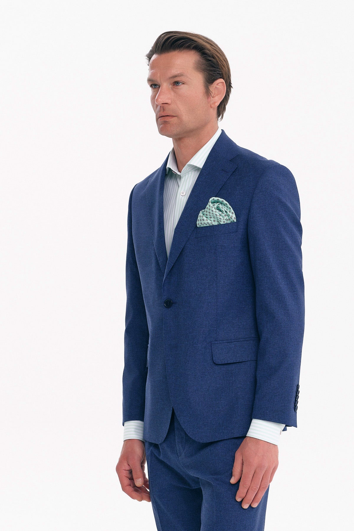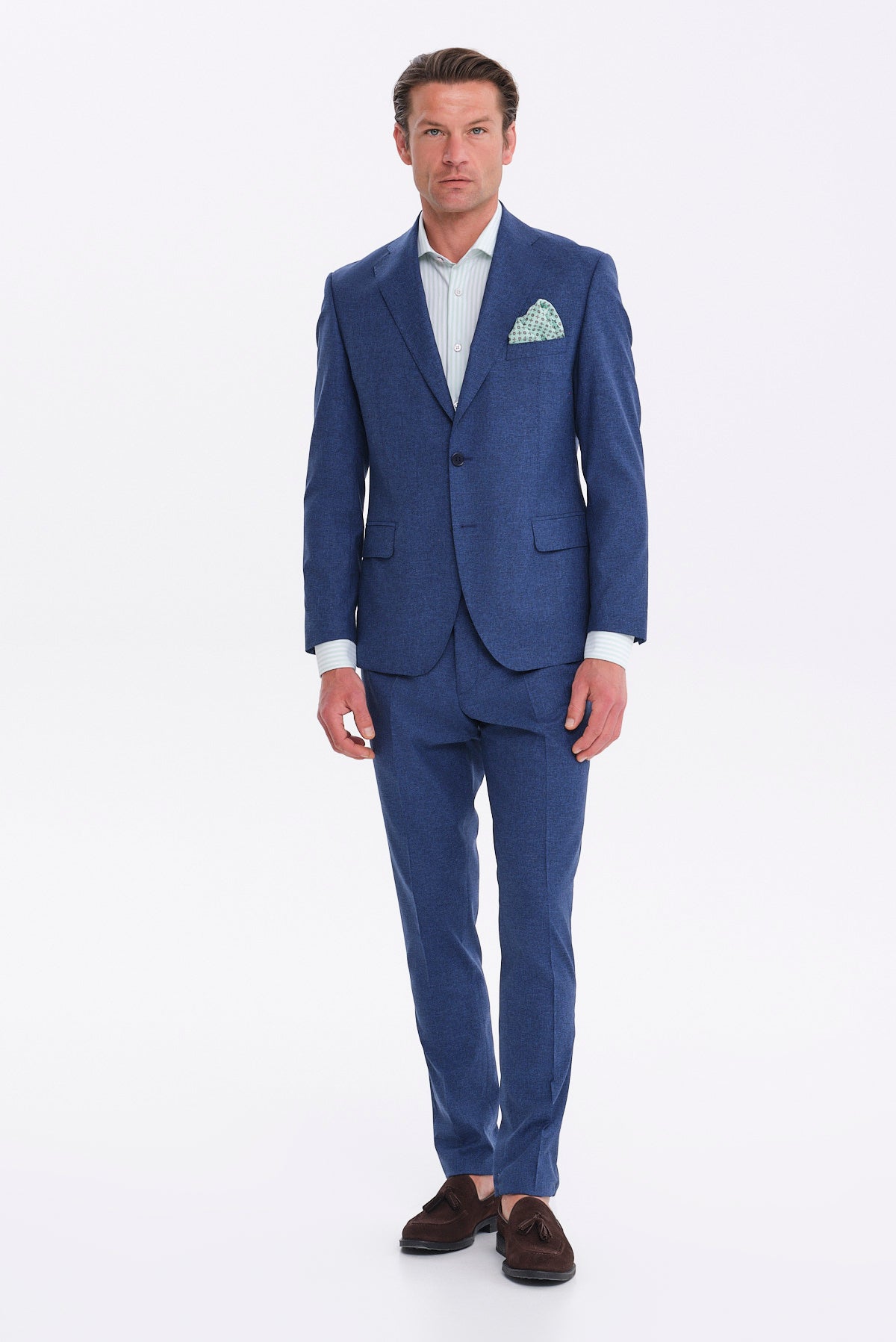- Κοστούμι μονόπετο, δίκουμπο, σε μπλε ραφ απόχρωση και slim γραμμή, με ύφασμα Guabello με σύνθεση από μαλλί, βαμβάκι και μετάξι. Ένα εντυπωσιακό κοστούμι για τις πιο ιδιαίτερες εμφανίσεις και συνδυασμούς.