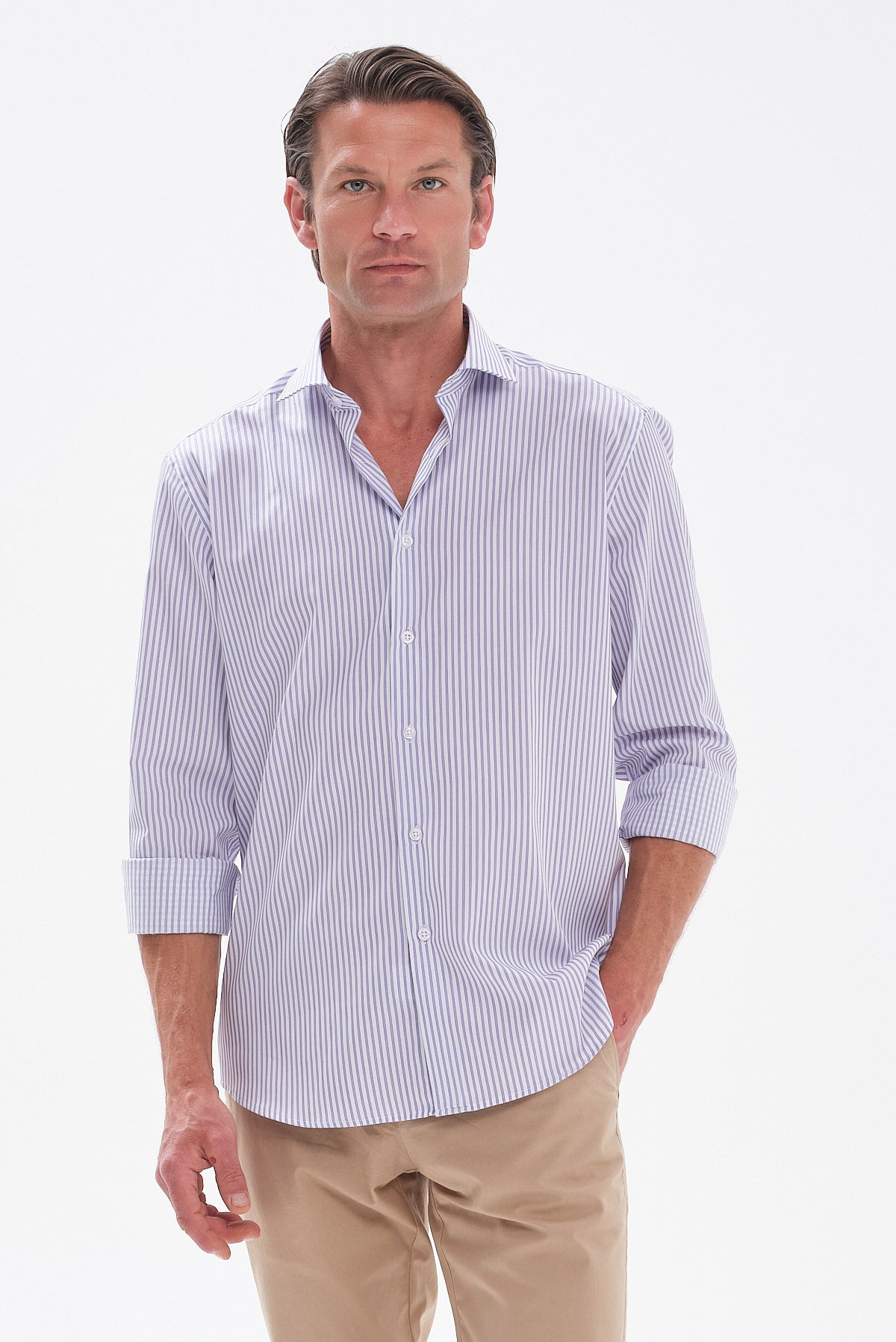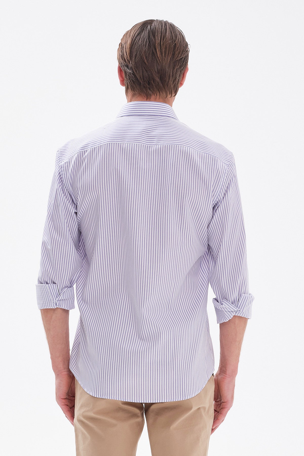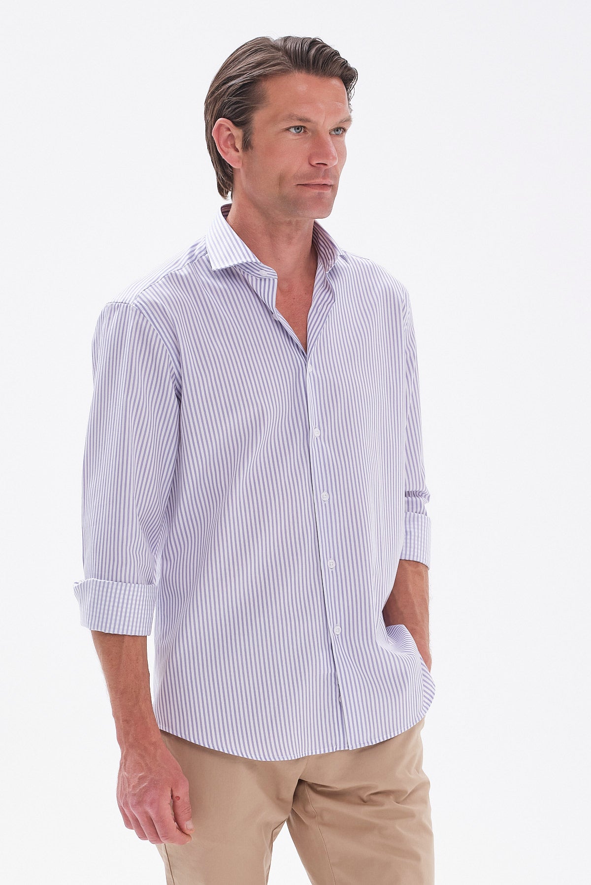 - Πουκάμισο ριγέ λιλά-λευκό και rex γιακά. Ένα πουκάμισο κλασικό απαραίτητο σε κάθε ανδρική γκαρνταρόμπα για business και smart εμφανίσεις το καλοκαίρι.