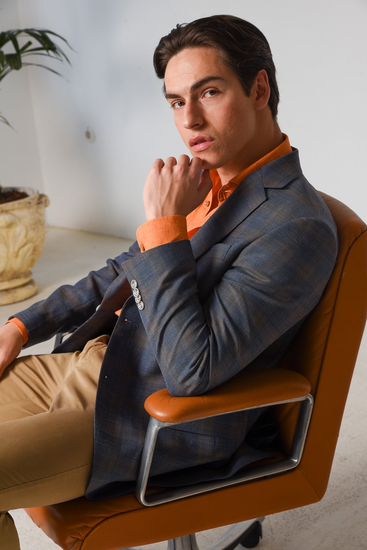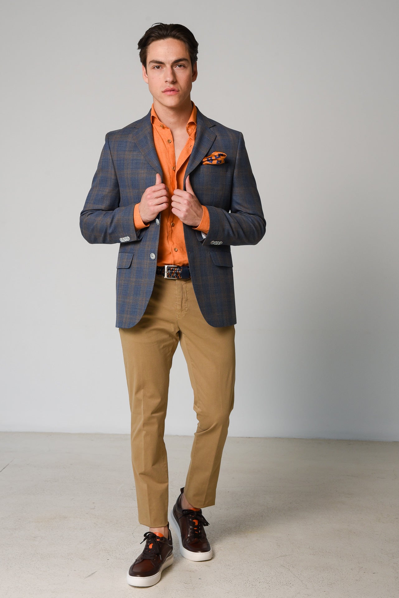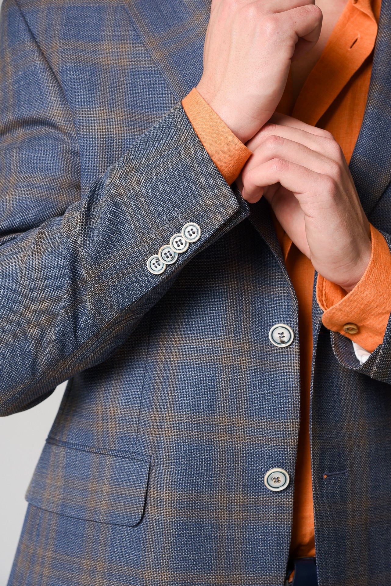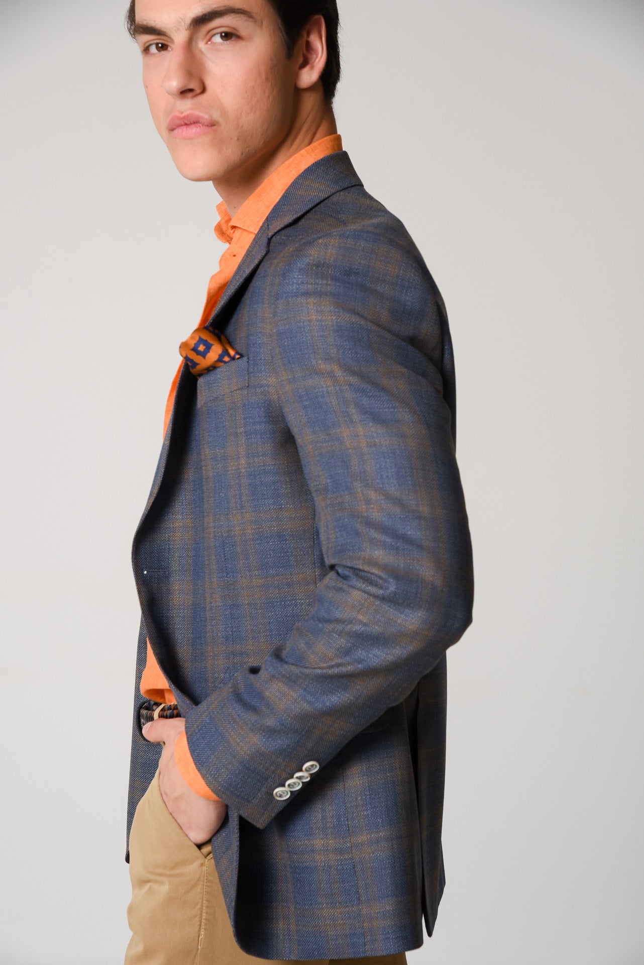 - Σακάκι μονόπετο, δίκουμπο windowpane σε μπλε χρώμα και καφέ λεπτομέρειες, από ύφασμα Marlane 100% αγνό παρθένο μαλλί. Ένα σακάκι για πολλές και στυλάτες εμφανίσεις.